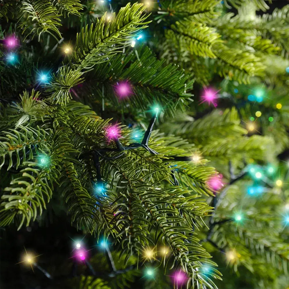 De verlichting beschikt over een groen snoer dat subtiel opgaat in de omgeving, waardoor de focus volledig op de sprankelende, multi-kleurige lampjes ligt. Eenvoudig aan te sluiten met een stekker, deze verlichting biedt extra gemak met een timerfunctie, een twinkle-effect en 8 verschillende lichtfuncties om de gewenste sfeer te creëren.