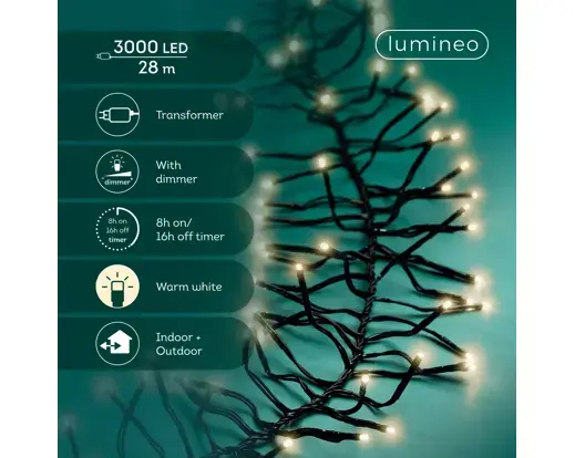 Breng een warme en betoverende sfeer naar je kerstdecoraties met de Lumineo LED Clusterverlichting. Deze indrukwekkende clusterverlichting van 28 meter met maar liefst 3000 LED-lampjes zorgt voor een schitterende en rijke uitstraling, perfect voor het verlichten van je kerstboom of het decoreren van je huis en tuin.