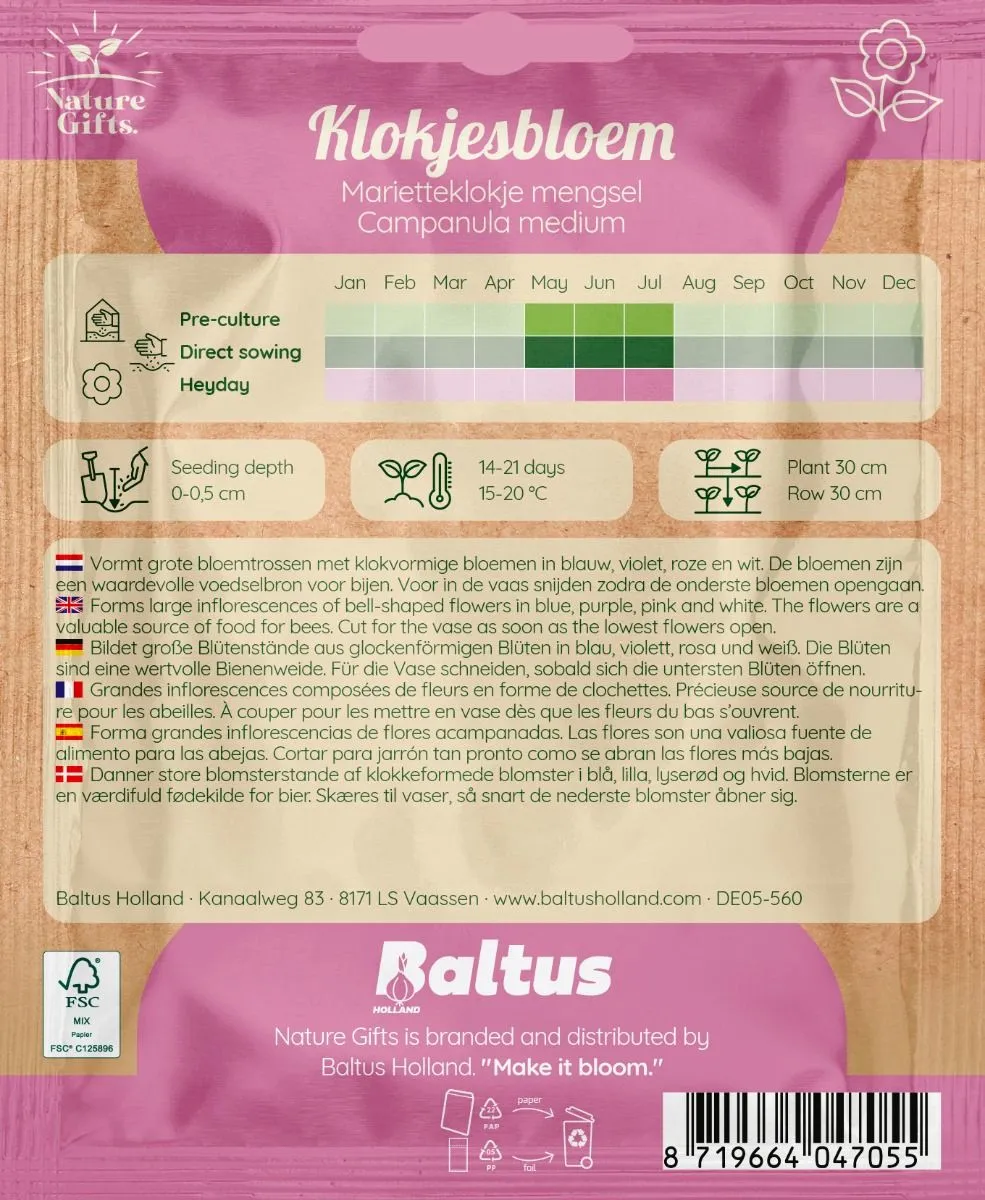 Mariëtteklokje mengsel. Vormt grote bloemtrossen met klokvormige bloemen in blauw, violet, roze en wit. De bloemen zijn een waardevolle voedselbron voor bijen. Bloeit in juni en juli.