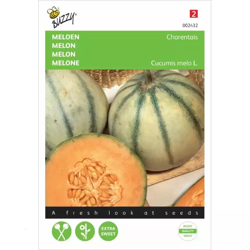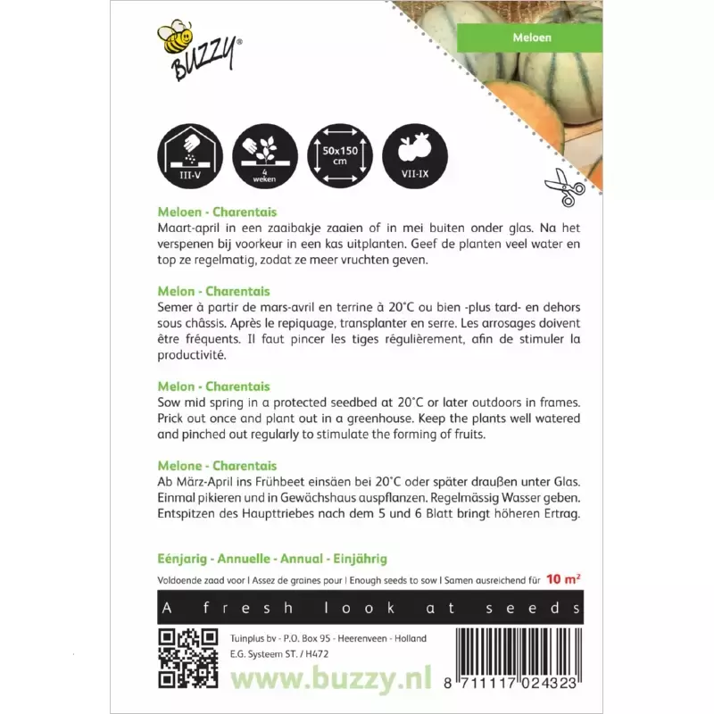 Meloen - Charentais_x005F_x000D_ Maart-april in een zaaibakje zaaien of in mei buiten onder glas. Na het_x005F_x000D_ verspenen bij voorkeur in een kas uitplanten. Geef de planten veel water en_x005F_x000D_ top ze regelmatig, zodat ze meer vruchten geven._x005F_x000D_