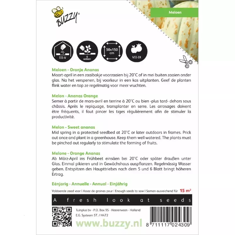 Meloen - Oranje Ananas_x005F_x000D_ Maart-april in een zaaibakje voorzaaien bij 20°C of in mei buiten zaaien onder_x005F_x000D_ glas. Na het verspenen, bij voorkeur in een kas uitplanten. Geef de planten_x005F_x000D_ flink water en top ze regelmatig voor meer vruchten.