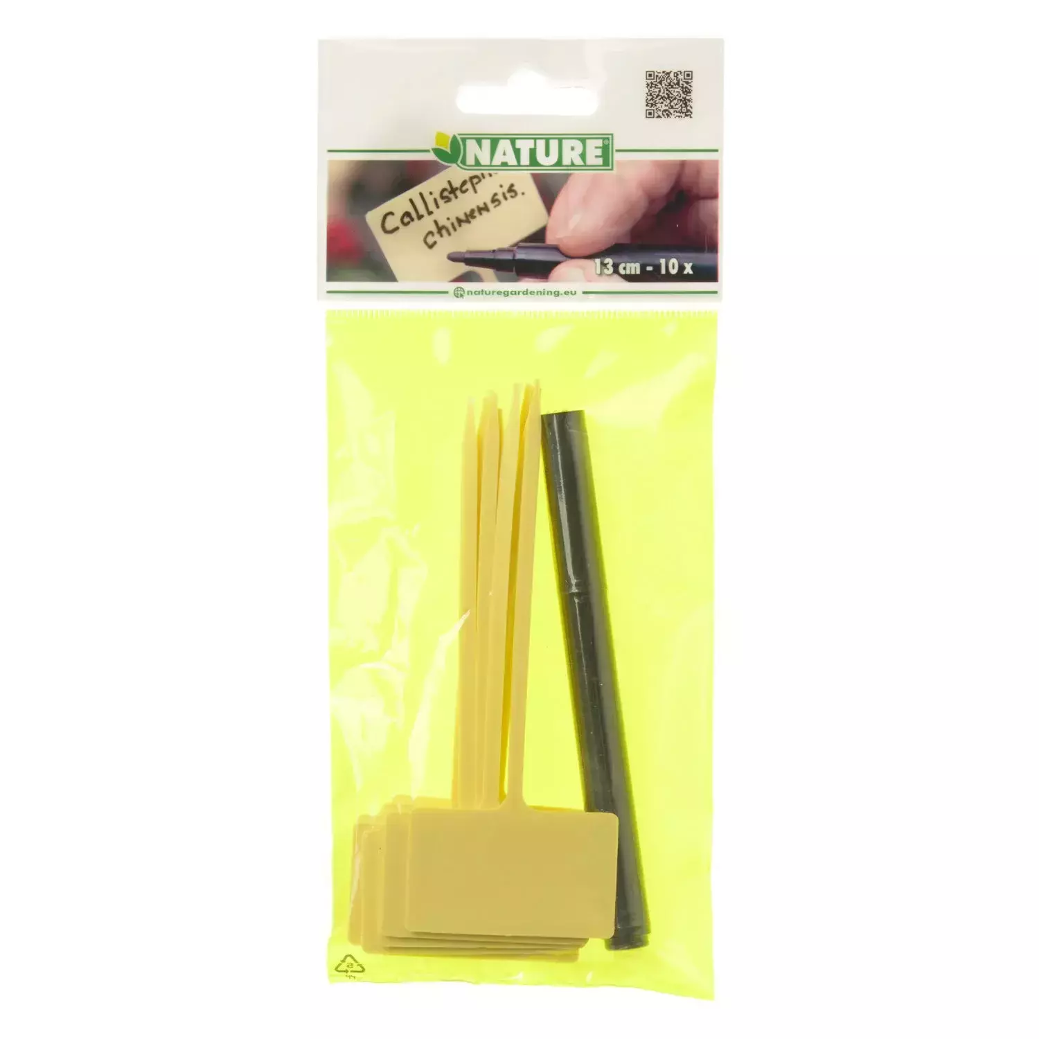 Gele kunststof plaatetiketten om planten te markeren in de tuin, verpakt per 10 stuks en wordt met een watervaste markeerstift geleverd. Hoogte is 13cm.