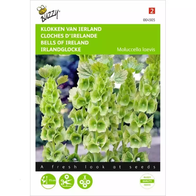 Klokken van Ierland_x000D_ Half maart-april onder glas zaaien of half april-eind mei buiten op een zaaibed._x000D_ Na 5/6 weken uitplanten. Bijzonder sterke snijbloem en bij uitstek geschikt_x000D_ voor boeketten. Ook een zeer opvallende verschijning in de border.