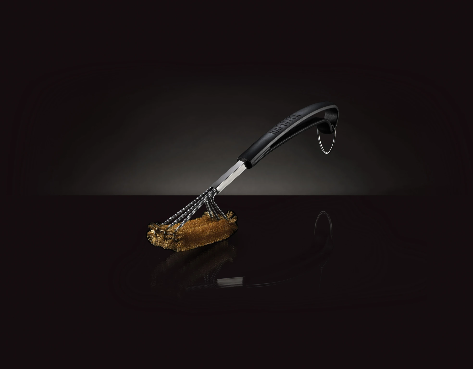 Napoleon drievoudige grillborstel met messing borstelharen is ontworpen om hardnekkige resten van gietijzeren grillroosters te verwijderen na een smakelijke barbecue. Met zijn gebogen handgreep voor extra kracht en verticale borstels voor het reinigen tussen de roosters, maakt deze borstel het schoonmaken snel en gemakkelijk. Handig voor RVS of porselein geëmailleerde grillroosters, en met een handige haak om binnen handbereik te hangen.