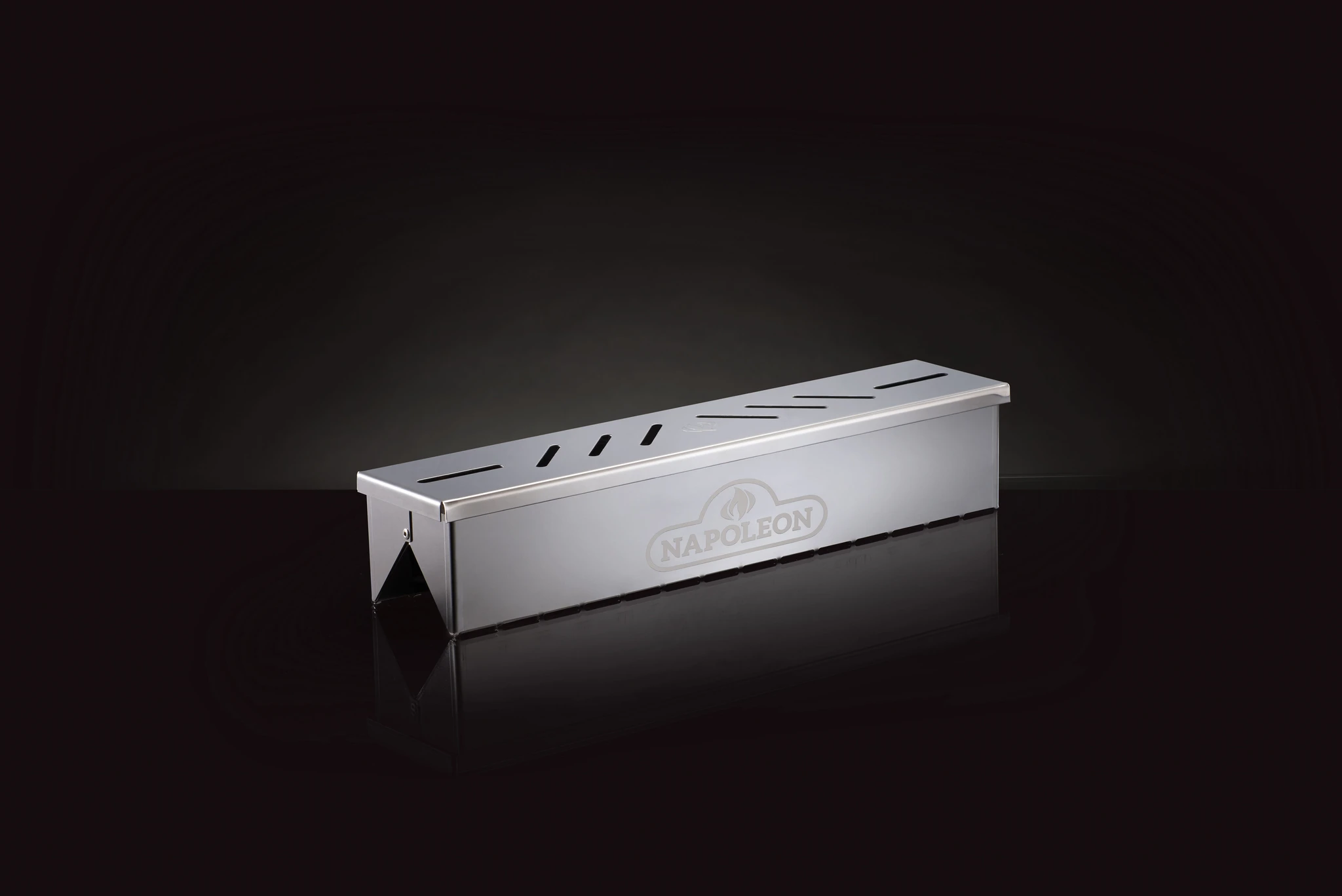 Geniet van de plezier en smaak van houtrook terwijl je je gasbarbecue gebruikt. De Napoleon roestvrijstalen rookdoos is speciaal gebouwd voor gebruik in Napoleon, Freestyle™ en Rogue® gasbarbecuegrills. Gemaakt van duurzaam roestvrij staal vervangt deze rookdoos de sear plates van een barbecue direct boven een brander. Om te gebruiken, verwijder je de kookroosters en een sear plate direct boven een brander. Vul de rookdoos met je favoriete smaak houtsnippers of stukken en doe het deksel erop. Vervang de kookroosters en zet de brander onder de rookdoos laag aan. De snippers of stukken beginnen te smeulen en produceren rook. Dit is ideaal wanneer je die heerlijke rokerige smaak aan je favoriete maaltijden wilt toevoegen. Om de beste resultaten te behalen, moet het voedsel minstens 20 minuten op de barbecue blijven.
