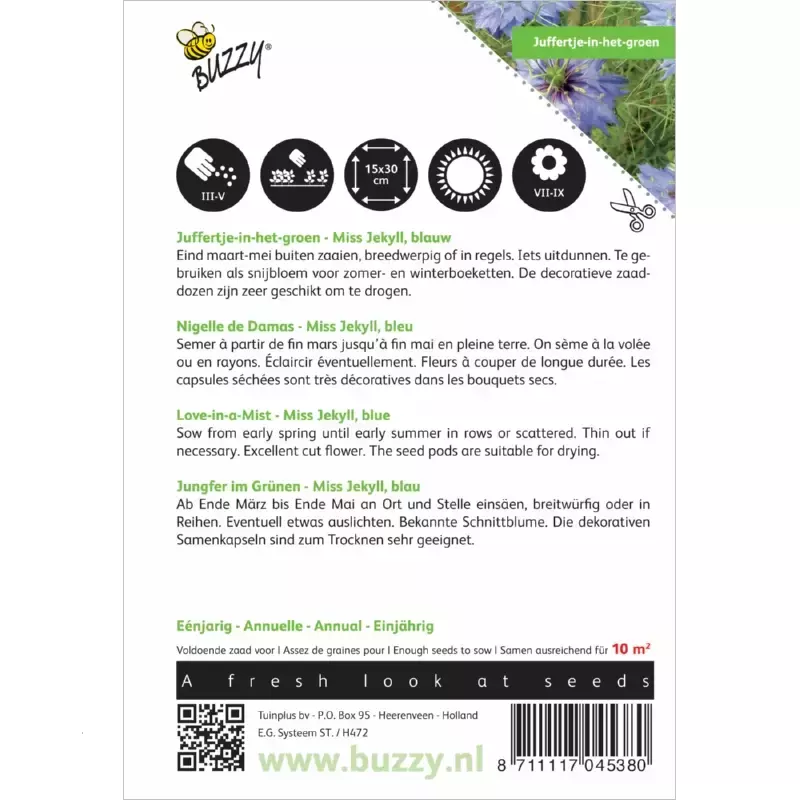 Juffertje-in-het-groen - Miss Jekyll, blauw_x000D_ Eind maart-mei buiten zaaien, breedwerpig of in regels. Iets uitdunnen. Te gebruiken als snijbloem voor zomer- en winterboeketten. De decoratieve zaaddozen zijn zeer geschikt om te drogen.