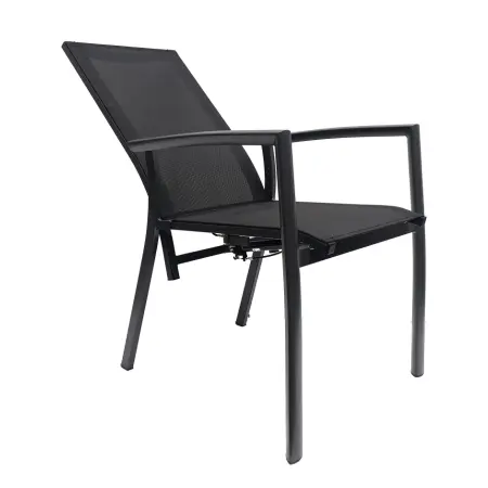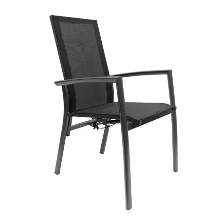De zitting en rugleuning zijn uitgevoerd in 2x1 textilene, een ademend en weerbestendig materiaal dat prettig aanvoelt en zich goed aanpast aan het lichaam. Dankzij de verstelbare rugleuning stelt u eenvoudig de gewenste zit- of relaxpositie in.