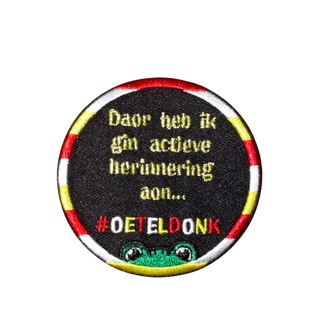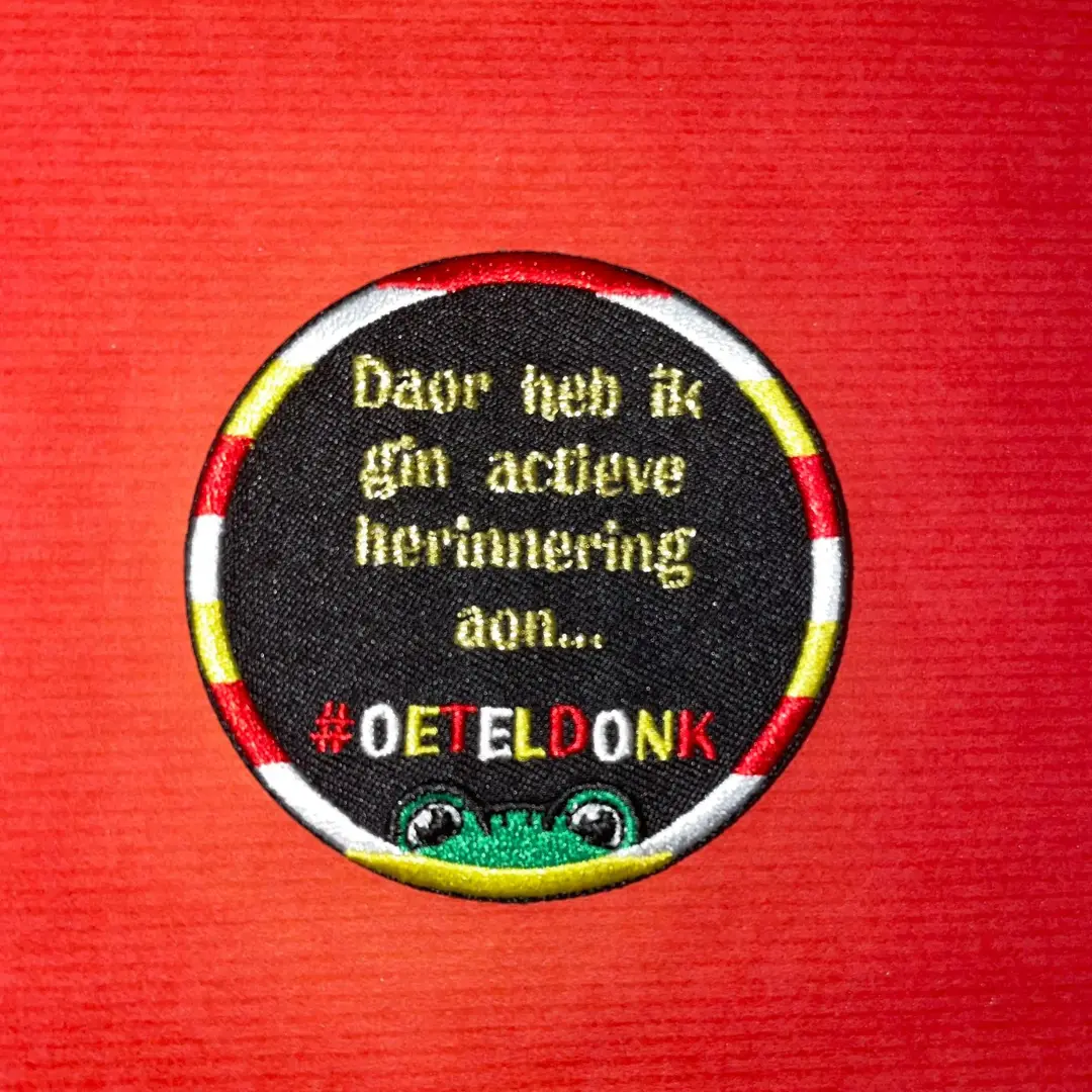 Laat het Oeteldonk embleem met de tekst 'Daor heb ik gin active herinnergin aon' jouw feestelijke geest vertegenwoordigen. Dit iconische embleem, met zijn speelse kikker en levendige kleuren, viert de onvergetelijke momenten van Oeteldonk. Draag dit embleem met trots en omarm de ongeëvenaarde sfeer van dit bruisende carnavalsfeest!