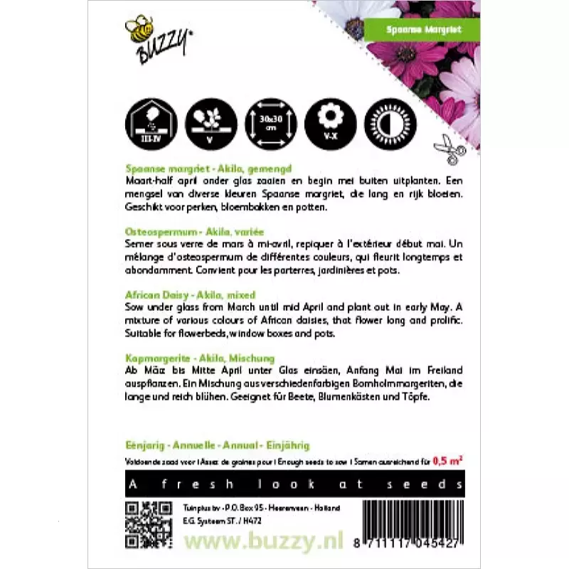 Spaanse margriet - Akila gemengd_x000D_ Vanaf maart tot half april onder glas zaaien; begin mei buiten uitplanten. Een_x000D_ mengsel van diverse kleuren spaanse margriet, die lang en rijk bloeit. Geschikt_x000D_ voor perken, bloembakken en potten._x000D_
