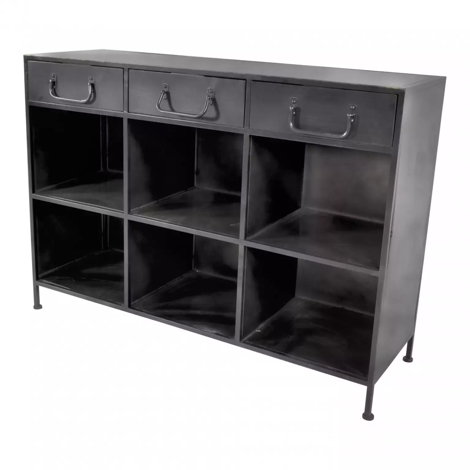 Deze industriële dressoirkast heeft 3 lades, 6 open vierkante vakken en natuurlijk nog plek bovenop de kast om spullen neer te zetten. De kast is gemaakt van staal en is zwart van kleur.