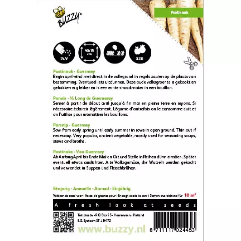 Pastinaak - Guernsey_x005F_x000D_ Vanaf begin april tot eind mei direct ter plaatse in de vollegrond in regels; in_x005F_x000D_ de regels eventueel iets uitdunnen. Oude volksgroente; men eet ‘t gekookt en_x005F_x000D_ wordt vaak gebruikt om smaak te geven aan een bouillon._x005F_x000D_