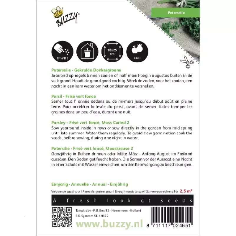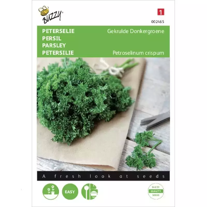 Peterselie - Gekrulde Donkergroene_x005F_x000D_ Jaarrond op regels binnen zaaien of half maart-begin augustus buiten in de_x005F_x000D_ vollegrond. Houdt de grond goed vochtig. Week de zaden voor het zaaien een nacht in een kom water om het ontkiemen te versnellen.
