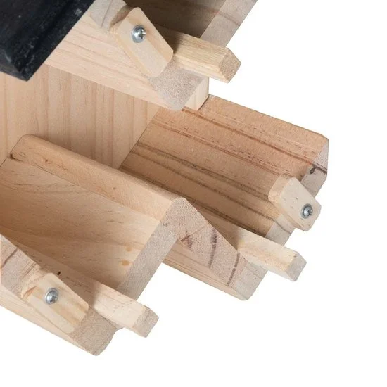 Deze handige houten pindakaaspothouder maakt het eenvoudig om drie potten vogelpindakaas op te hangen, waarbij je ze zonder deksel simpelweg in de houder schuift, aan een muur, boom of houten schutting.