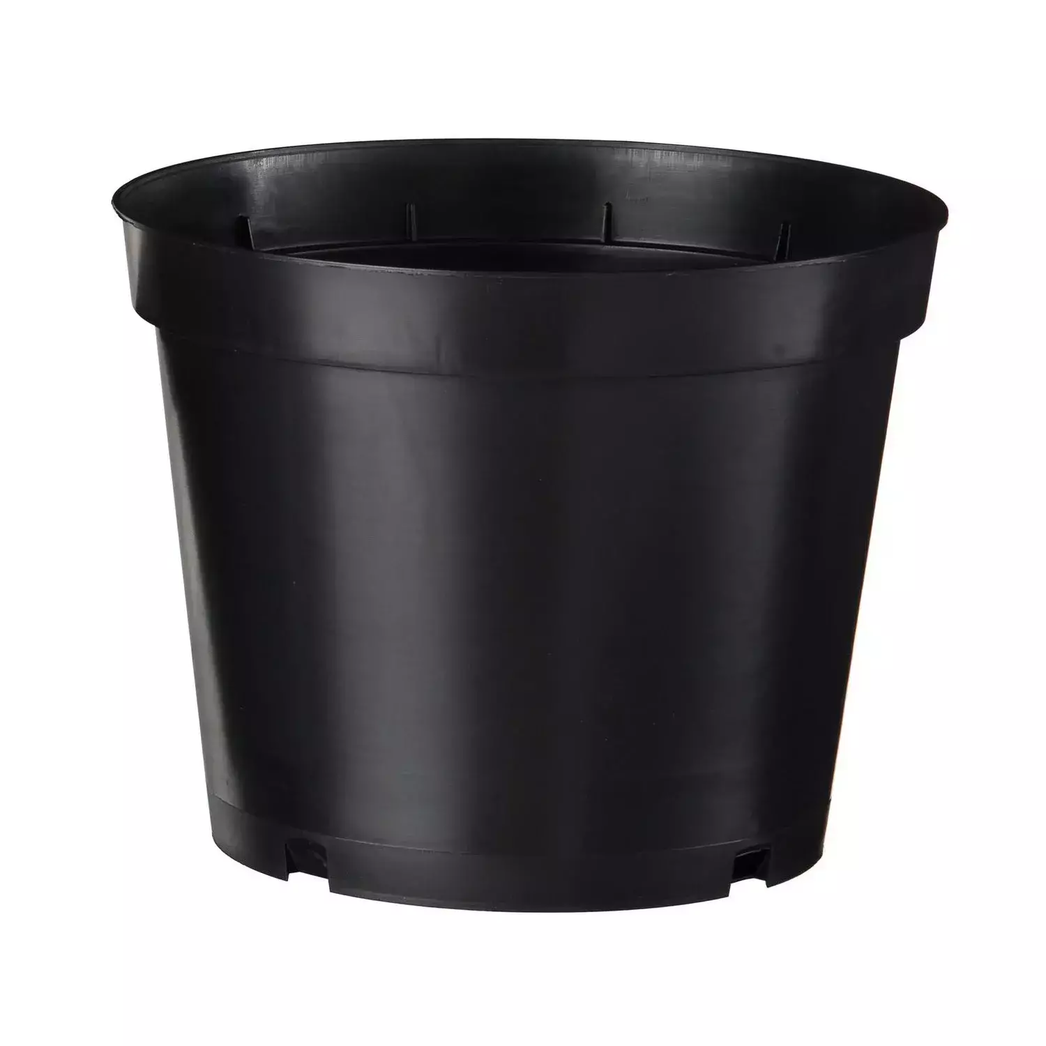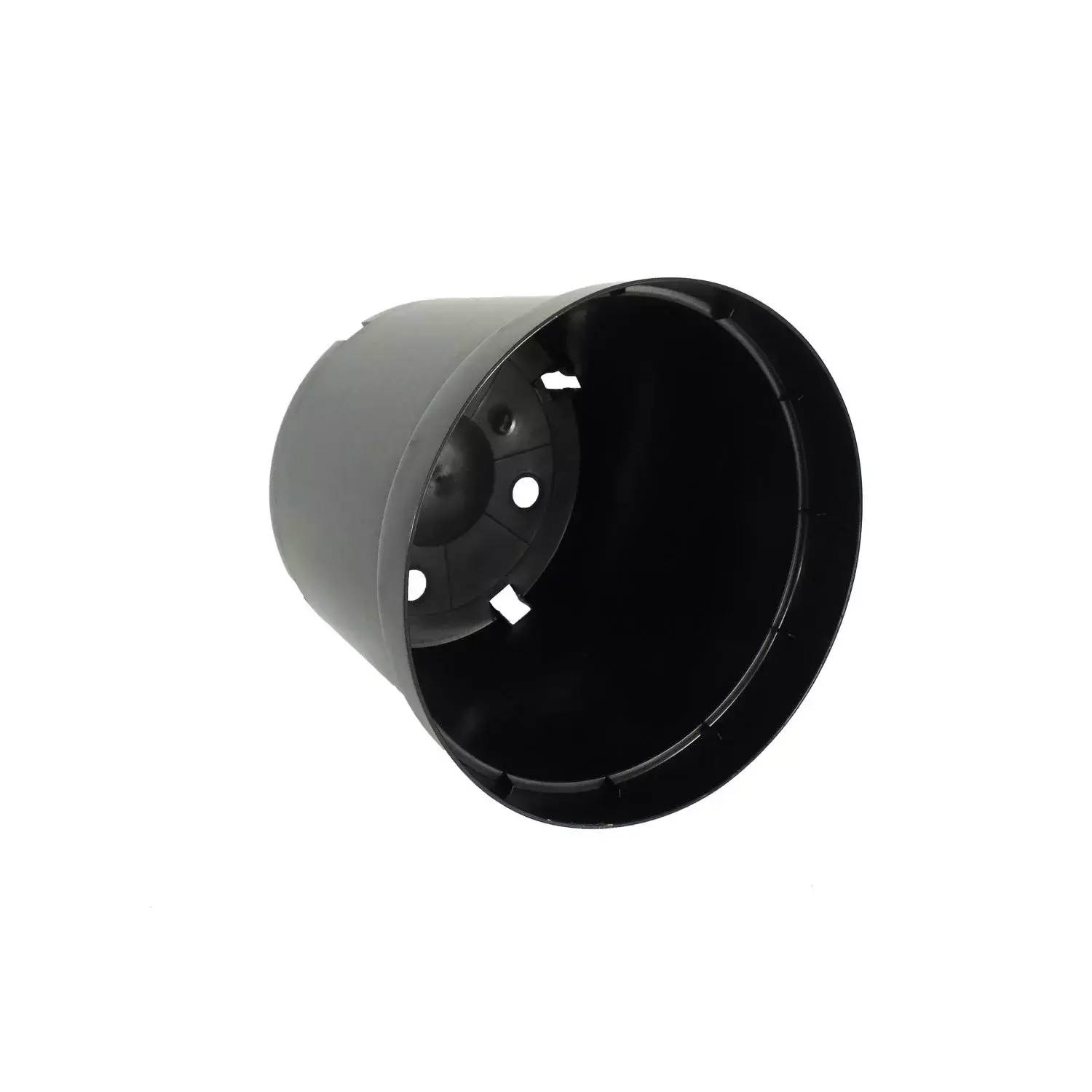 Zwarte tuinplantcontainer van kunststof met gaten en inkepingen aan de binnenkant. De plantcontainer is geschikt voor buitengebruik en heeft een inhoud van 2L. Verpakt per 5 stuks.