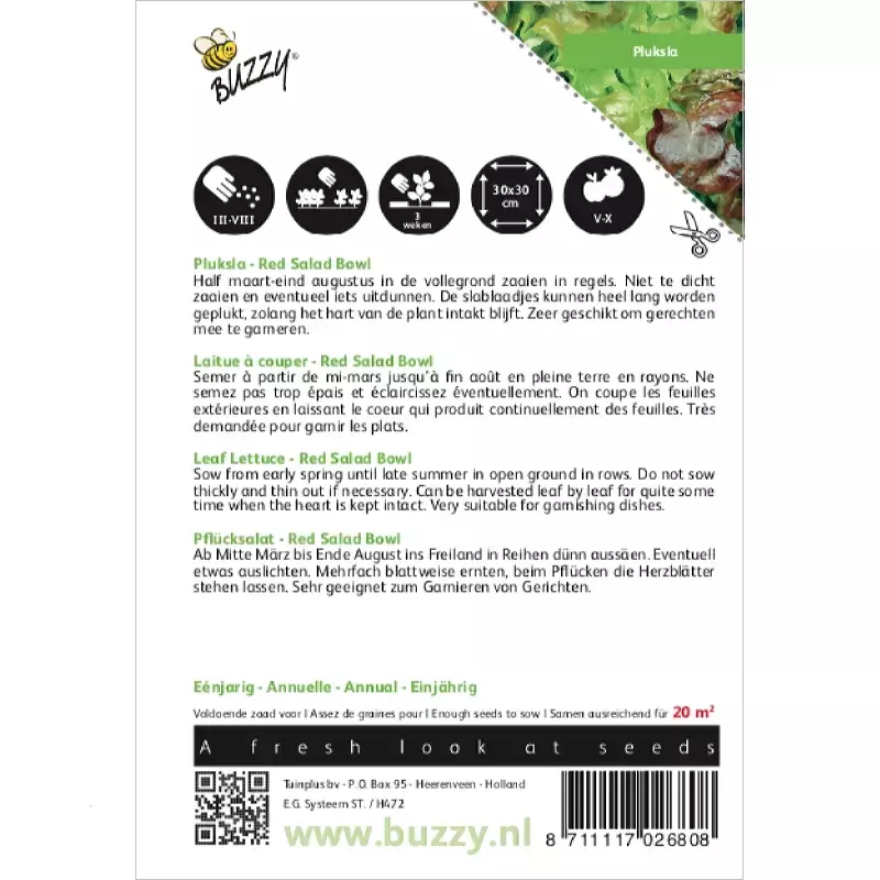 Pluksla - Red Salad Bowl, Rode Eikenblad_x005F_x000D_ Half maart-eind augustus in de vollegrond zaaien in regels. Niet te dicht_x005F_x000D_ zaaien en eventueel iets uitdunnen. De slablaadjes kunnen heel lang worden_x005F_x000D_ geplukt, zolang het hart van de plant intakt blijft. Zeer geschikt om gerechten_x005F_x000D_ mee te garneren._x005F_x000D_ _x005F_x000D_