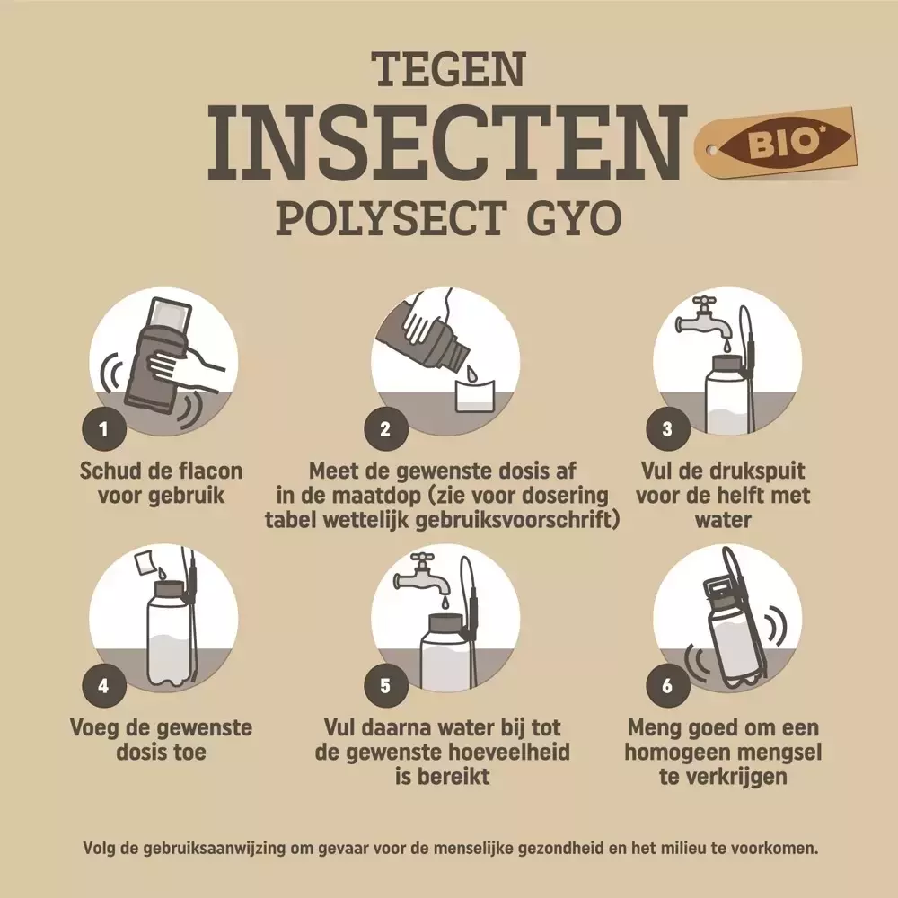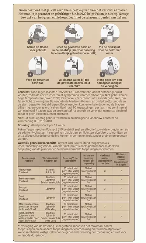 Gebruik Pokon Bio tegen insecten spray in de maanden februari tot oktober. Dit zijn de maanden wanneer de eerste insecten of symptomen waarneembaar zijn. Het beste is om dit product in de ochtend of avond te gebruiken, zodat je het felle zonlicht vermijdt