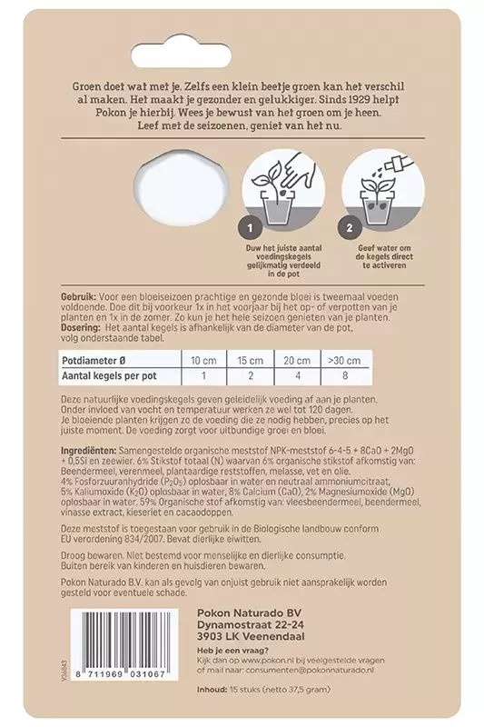 Pokon Bio Terras & Balkon Planten Voedingkegels zijn ideaal voor het langdurig voeden van planten in potten, waarbij ze essentiële voedingsstoffen ontvangen voor een gezonde groei en bloei gedurende het hele seizoen. Volg de instructies voor het beste resultaat en geniet van prachtige, gezonde planten op je terras of balkon.