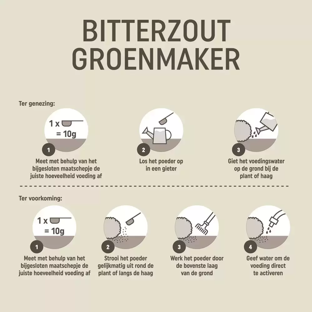 Pokon Bitterzout Groenmaker herstelt magnesiumtekorten bij buxus en coniferen, verbetert hun groene kleur. Voor genezing: los 150 g poeder op in 10 liter water en giet bij planten. Voor preventie: strooi 20 g poeder per m². Gebruik elke 4-6 weken indien nodig.