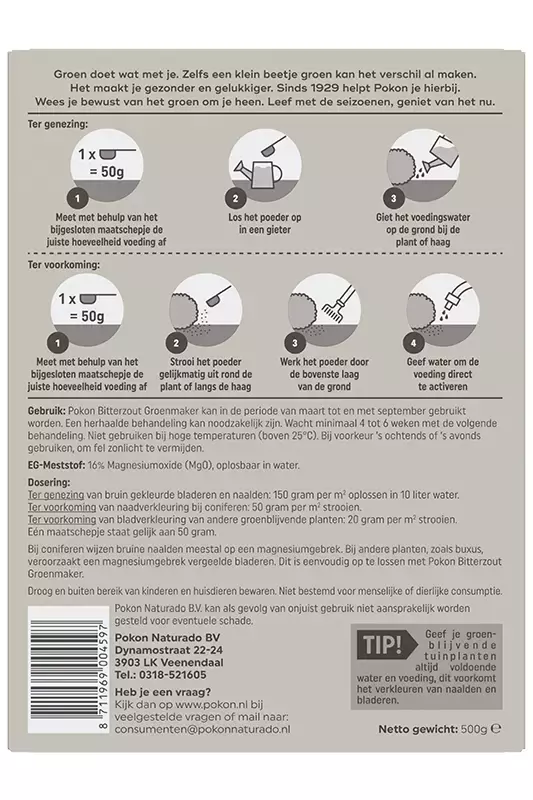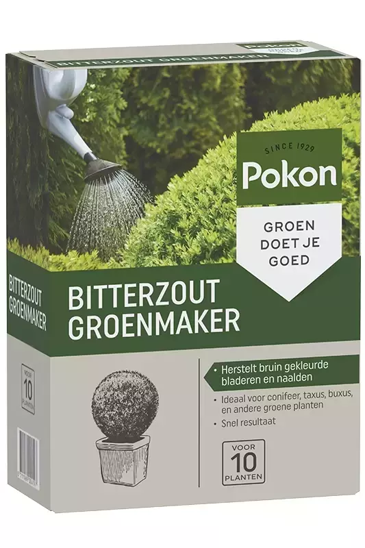 Pokon Bitterzout Groenmaker is speciaal ontwikkeld om magnesiumgebrek bij buxus en coniferen aan te pakken. Het gebrek aan magnesium uit zich vaak in vergeelde bladeren bij buxus en bruine naalden bij coniferen. Door Pokon Bitterzout Groenmaker te gebruiken, wordt het magnesiumniveau hersteld en krijgen je planten hun groene kleur terug.