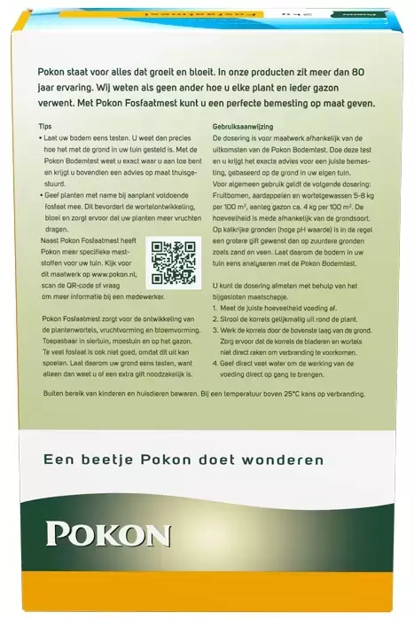 Pokon Fosfaatmest stimuleert de ontwikkeling van plantenwortels, vruchtvorming en bloemvorming. Vooral bij het aanplanten is voldoende fosfaat van essentieel belang. Dit bevordert niet alleen de wortelgroei en bloei, maar zorgt er ook voor dat planten overvloediger vruchten dragen.