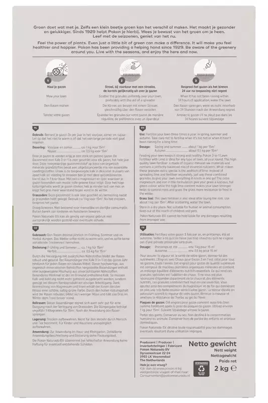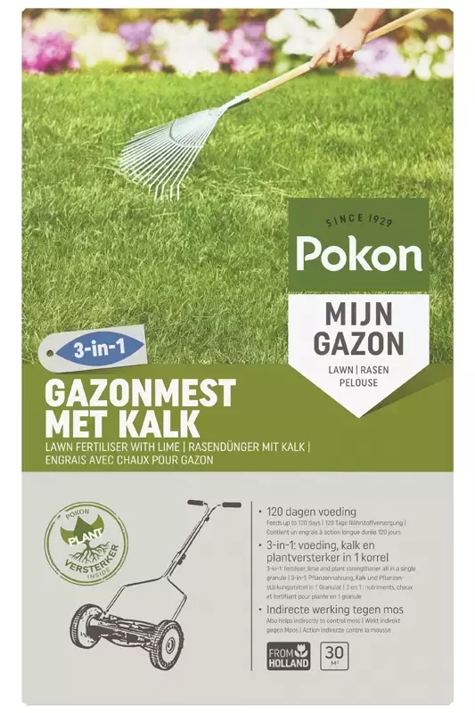 De Gazonmest met Kalk 3-in-1 is zeer geschikt voor elk gazon, het hele jaar door. Deze hoogwaardige gazonmeststof op basis van organische minerale grondstoffen bevat een uitgebalanceerde mix van essentiële voedingsstoffen. Bovendien bevat het extra magnesium en ijzer waardoor je gazon een mooie volle groene kleur krijgt. Door het hoge kaliumgehalte wordt je gazon sterker, heb je minder last van mos en krijgt het gras meer weerstand tegen vorst in de winter.Kalk strooi je in het voor- en najaar om de bodem van je gazon te verbeteren. Bij Pokon Gazonmest met Kalk 3-in-1 hebben wij kalk in de mestkorrels toegevoegd. In plaats van apart kalk en voeding te strooien ben je met deze gecombineerde korrel dus in 1 keer klaar.Pokon Gazonmest met Kalk 3-in-1 bevat een plantversterkend mineraal (Si). De toevoeging van deze Pokon Plantversterker zorgt voor steviger gras dat beter bestand is tegen droogte en ziektes. Daarnaast zal het gras mooier rechtop staan waardoor het beter te maaien blijft, ook als het wat langer is.Voor een jaarrond sterk en gezond gazon bemest je het gazon 3x per jaar.In het voorjaar: maart/april ca. 1kg voor 10m2 Rond de zomer: mei/juni ca. 0,75kg voor 10m2 In het najaar: september/oktober ca. 0,5kg voor 10 m2