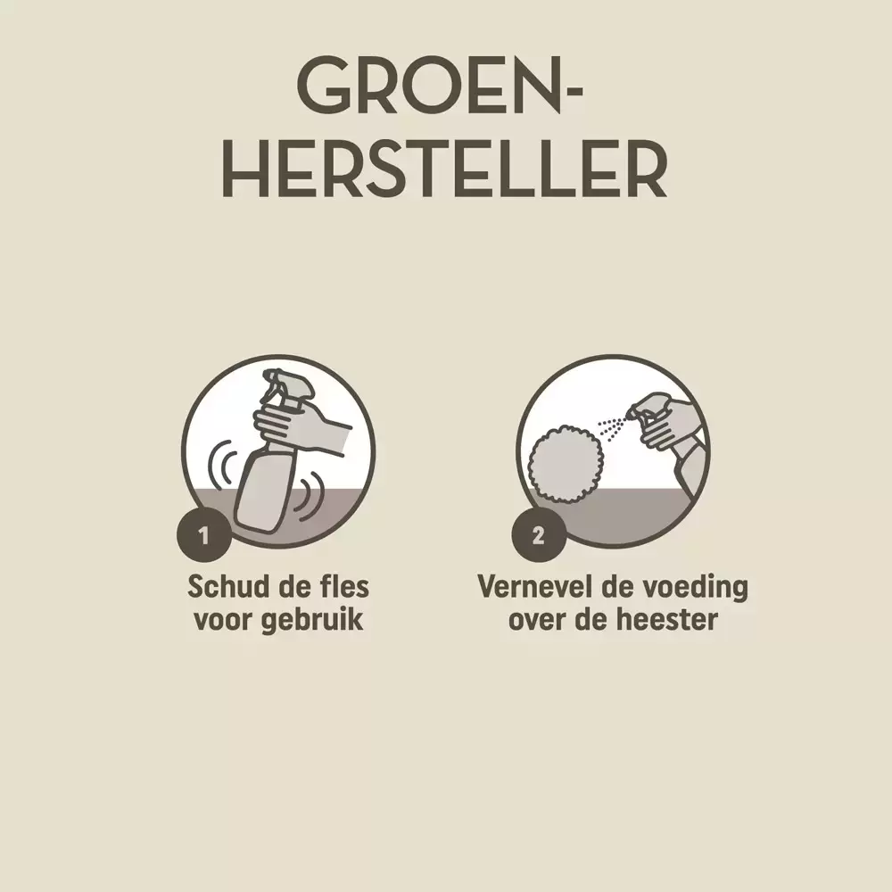 Pokon Groenhersteller is een effectieve oplossing om vergeelde of bruin geworden bladeren van buxus en andere groenblijvende planten snel weer donkergroen te maken. Deze voeding is verpakt in een handige sprayflacon voor directe toepassing op het bladoppervlak. Het bevat een uitgebalanceerde voedingsformule met extra stikstof, die snel door de bladeren wordt opgenomen. Hierdoor herstellen de bladeren snel en krijgen ze hun oorspronkelijke groene kleur terug. Pokon Groenhersteller kan ook worden gebruikt voor andere groenblijvende planten zoals coniferen, taxus, skimmia en heesters.