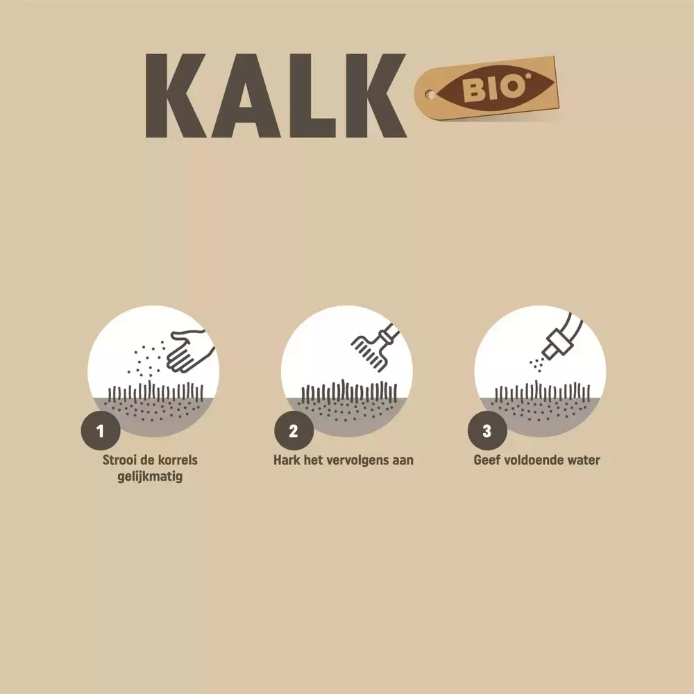 - Inwerken: Hark de kalk door de bovenlaag van de grond. Op het gazon kun je de korrels op het gras laten liggen.