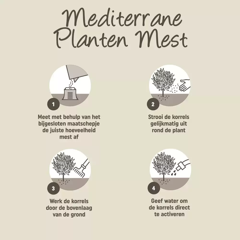 - Voor het beste resultaat bemest je je mediterrane planten twee keer per jaar, vroeg in de lente en in de zomer.