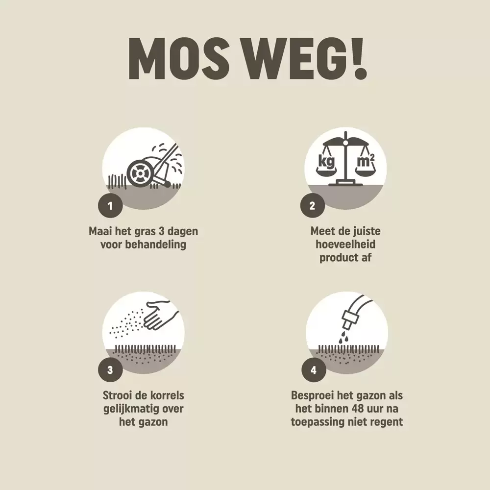De beste periode om mos te bestrijden is van maart tot en met mei en van september tot en met december. Vermijd toepassing in de zomer. Voor het beste resultaat mag de grond niet bevroren zijn, moet zware regen uitblijven en mag de buitentemperatuur niet te hoog zijn om verbranding van het gras te voorkomen. Maai het gazon de eerste vier dagen na gebruik niet.