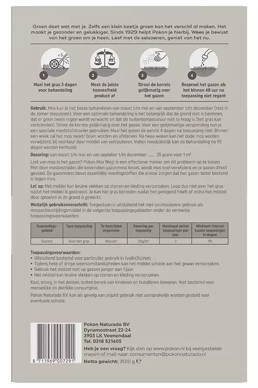 Heb je last van mos in je gazon? Met Pokon Mos Weg! pak je dit probleem effectief aan. Deze mosbestrijder bevat ook gazonmest, waardoor het mos snel verdwijnt en je gras direct wordt gevoed. De essentiële voedingsstoffen in de mest helpen het gazon sterker te maken en beter bestand tegen mos.