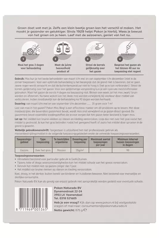 Heb je last van mos in je gazon? Met Pokon Mos Weg! pak je dit probleem effectief aan. Deze mosbestrijder bevat ook gazonmest, waardoor het mos snel verdwijnt en je gras direct wordt gevoed. De essentiële voedingsstoffen in de mest helpen het gazon sterker te maken en beter bestand tegen mos.