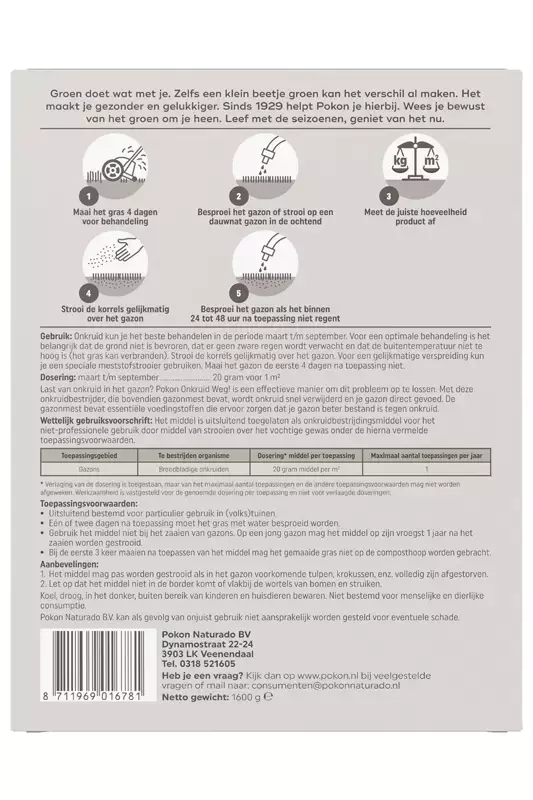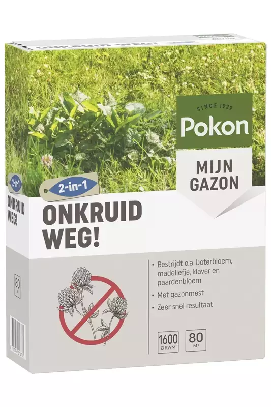 Heb je last van onkruid in je gazon? Met Pokon Onkruid Weg! geniet je op een eenvoudige en doeltreffende manier weer van een prachtig gazon. Deze gazonmest met onkruidbestrijder voorziet het gras van extra voeding, wat bijdraagt aan een snel herstel. Het middel werkt effectief tegen onder andere boterbloemen, madeliefjes, witte klaver en paardenbloemen. Hoe snel het onkruid verdwijnt, hangt af van de weersomstandigheden, zoals temperatuur en luchtvochtigheid. Gemiddeld duurt het 2 tot 3 weken voordat het onkruid volledig is verdwenen.