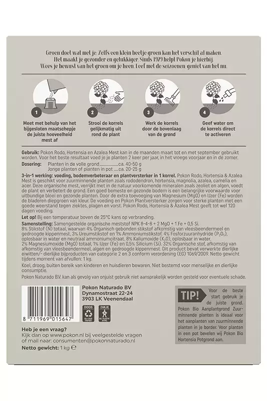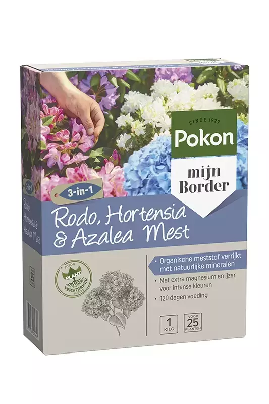 Pokon Rodo, Hortensia & Azalea Mest is speciaal ontwikkeld om zuurminnende planten zoals hortensia's, rododendrons, en azalea's uitbundig te laten bloeien en meer weerstand te geven. Verrijkt met natuurlijke mineralen zoals zeoliet en algen, verbetert deze organische voeding niet alleen de voedingstoestand van de planten, maar ook de kwaliteit van de grond. De toegevoegde Magnesium (MgO) en IJzer (Fe) bevorderen een intensere bloemkleur.