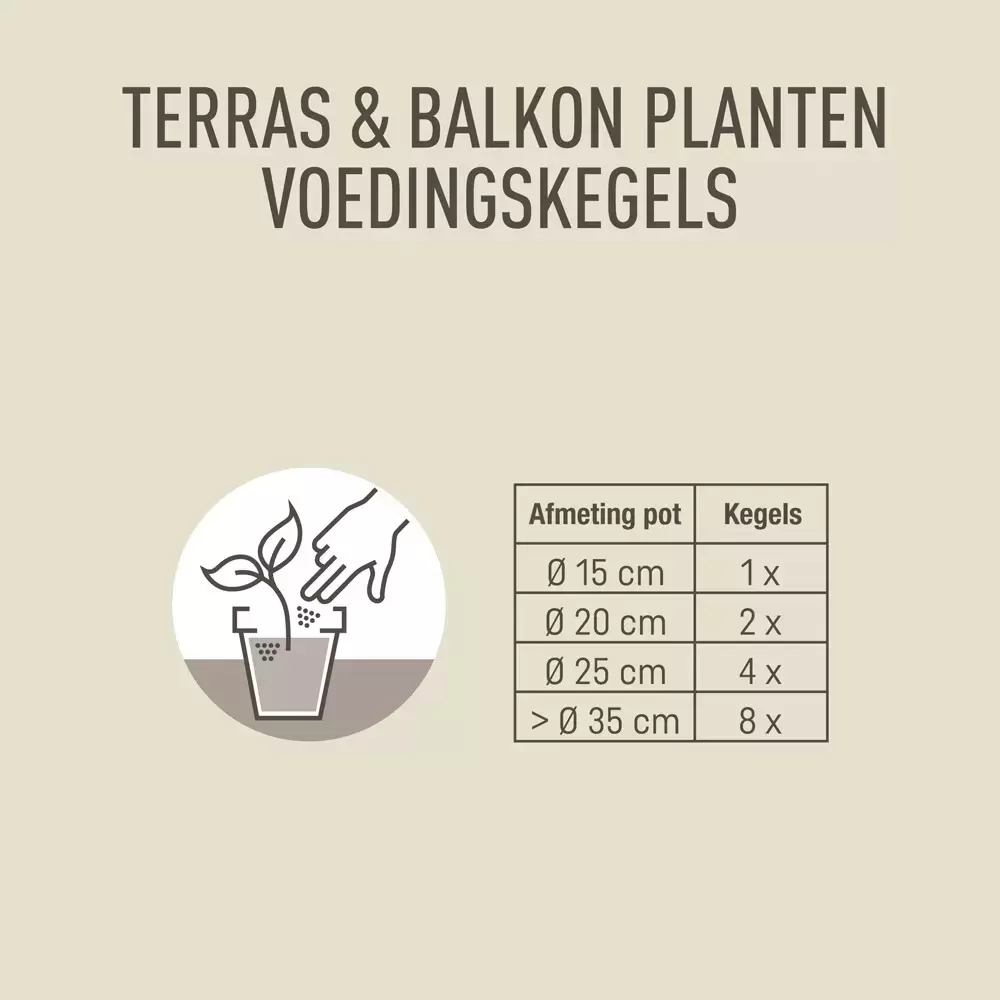 Eenvoudig in gebruik door de voedingskegels gelijkmatig rondom de plant in de pot te plaatsen. Vervolgens activeer je ze door water te geven.