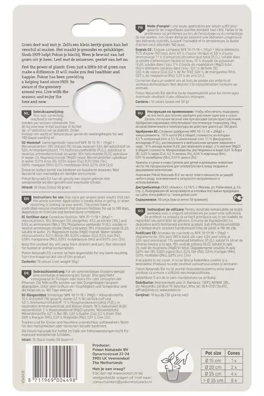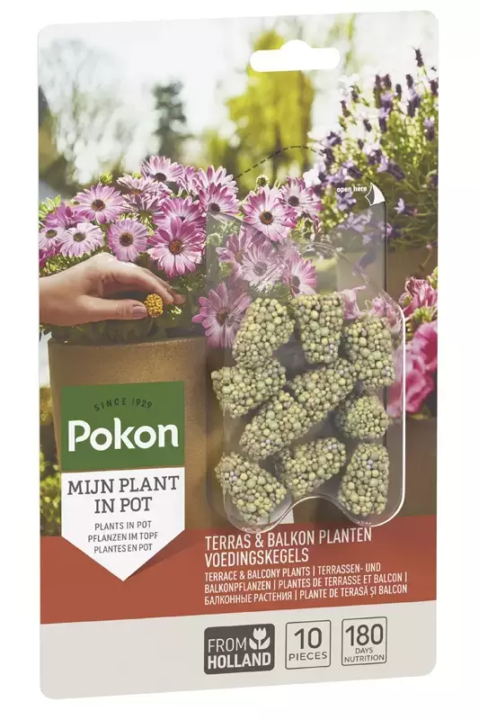 De "slimme" voedingskegels van Pokon geven je terras- en balkonplanten zoals geraniums, violen en petunia's geleidelijk voeding gedurende maar liefst 180 dagen. Deze kegels reageren op vocht en temperatuur, waardoor je planten precies de voeding krijgen die ze nodig hebben voor een gezonde groei en bloei gedurende het hele seizoen.