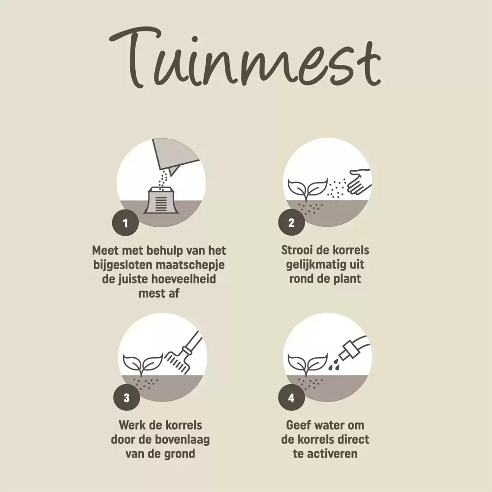 - Strooi de korrels gelijkmatig rond de plant.