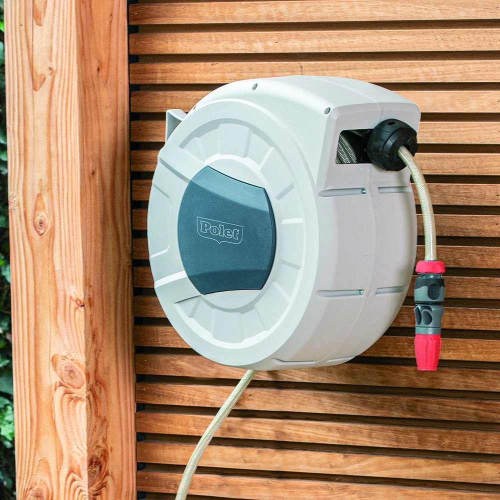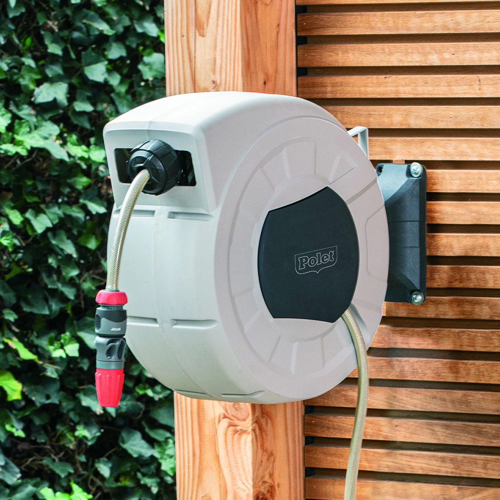 De Polet Wandhaspel met Automatisch Oprolsysteem zorgt voor eenvoudig en netjes oprollen van je tuinslang na gebruik, ideaal voor muurbevestiging.