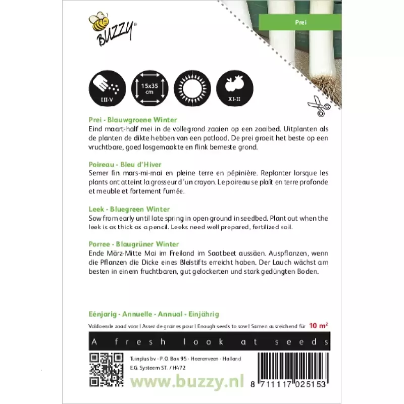 Prei - Blauwgroene Winter_x005F_x000D_ Eind maart-half mei in de vollegrond zaaien op een zaaibed. Uitplanten als_x005F_x000D_ de planten de dikte hebben van een potlood. De prei groeit het beste op een_x005F_x000D_ vruchtbare, goed losgemaakte en flink bemeste grond.