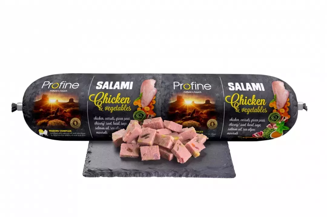 Deze salamiworst van Profine bestaat voor 90% uit kippenorganen en kippenvlees.