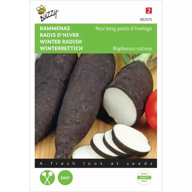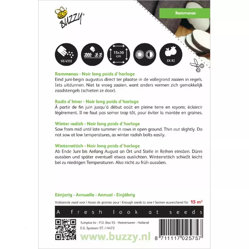 Rammenas - Noir long poids d’horloge_x005F_x000D_ Eind juni-begin augustus direct ter plaatse in de vollegrond zaaien in regels._x005F_x000D_ Iets uitdunnen. Niet te vroeg zaaien, want anders vormen zich gemakkelijk_x005F_x000D_ zaadstengels (schieten ze door).
