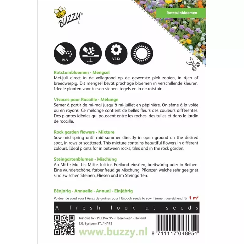 Rotstuinbloemen - Mengsel_x000D_ Mei-juli direct in de vollegrond op de gewenste plek zaaien, in rijen of_x000D_ breedwerpig. Dit mengsel bevat prachtige bloemen in verschillende kleuren._x000D_ Ideale planten voor tussen stenen, tegels en in de rotstuin.
