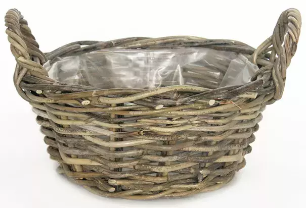 Deze mand heeft een schaalvorm en is gemaakt van rotan. De binnenkant is afgedekt met plastic. De diameter van de mand is 35 cm, de hoogte 15 cm en de kleur van de mand is antiek grijs. Door de met plastic afgedekte binnenkant is de mand voor binnen en buiten te gebruiken.