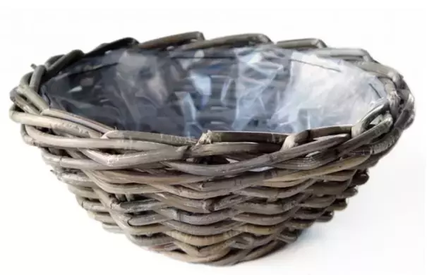 De grijze ronde schaal is gemaakt van rotan. De binnenkant is afgedekt met plastic. De schaal heeft een diameter van 30 cm en is 12 cm hoog.