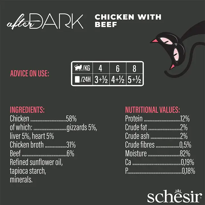 Schrijf zelf een recensie over "Schesir after Dark kip en rund paté bouillon 80g"
