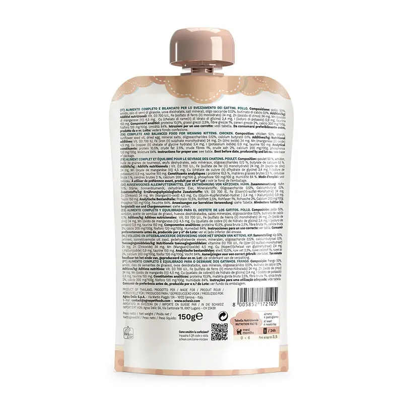 Deze voedzame crème, gemaakt van echte kipfilets, is speciaal ontworpen voor kittens van 0 tot 6 maanden. De zachte textuur is ideaal voor het spenen en helpt bij de ontwikkeling van het immuunsysteem.