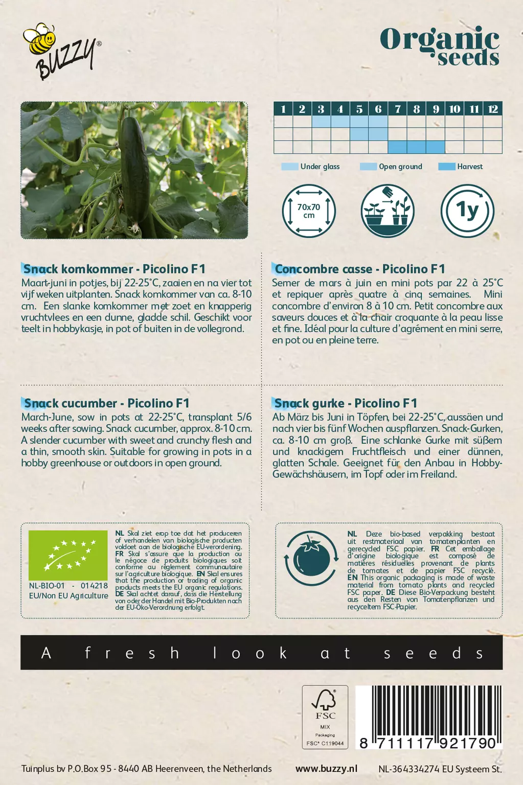 Snack komkommer - Picolino F1_x000D_ Maart-juni in potjes, bij 22-25°C, zaaien en na vier tot vijf weken uitplanten. Snack komkommer van ca. 8-10 cm. Een slanke komkommer met zoet en knapperig vruchtvlees en een dunne, gladde schil. Geschikt voor teelt in hobbykasje, in pot of buiten in de vollegrond.