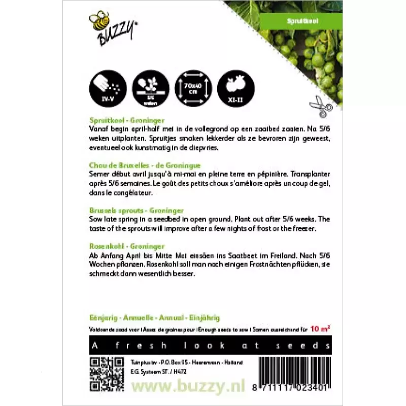Spruitkool - Groninger_x005F_x000D_ Vanaf begin april tot half mei in de volle-grond op zaaibed en ca. 5-6 weken_x005F_x000D_ later uitplanten. Spruitjes smaken lekkerder als ze bevroren zijn geweest._x005F_x000D_ Eventueel kan dit kunstmatig in de diepvries._x005F_x000D_ _x005F_x000D_