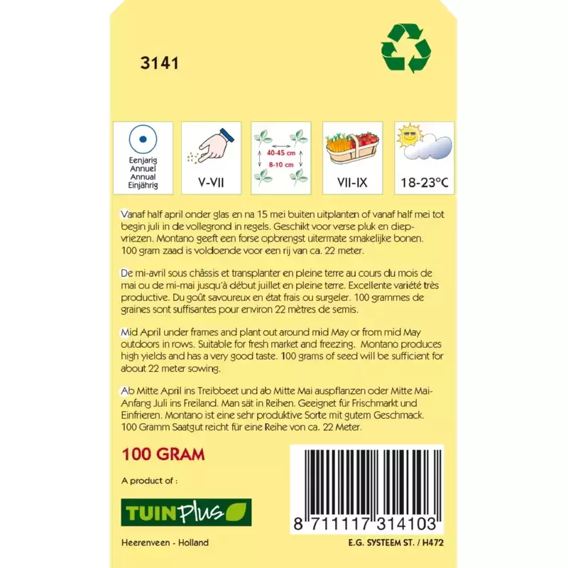 Vanaf half april zaaien onder glas en na 15 mei buiten uitplanten of vanaf half mei tot begin juli zaaien in de volle grond in regels. Geschikt voor verse pluk en om in te vriezen. Montano geeft een forse opbrengst uitermate smakelijke bonen.