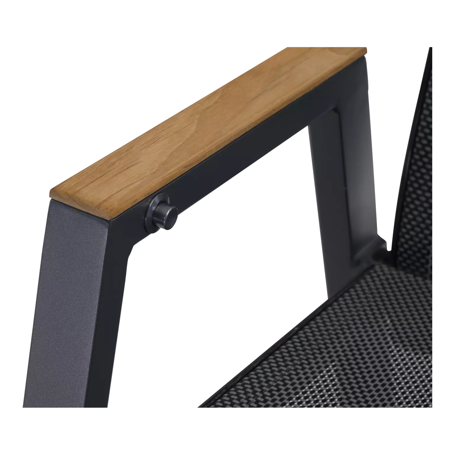 De armleuningen van de Amir Teak Negro zijn vervaardigd uit hoogwaardig teak, een duurzaam en weerbestendig houtsoort. Teak staat bekend om zijn lange levensduur en luxe uitstraling, wat deze stoel een verfijnde en elegante touch geeft.