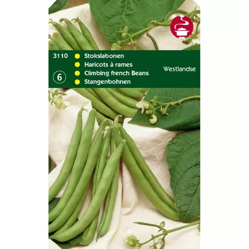 Stokslabonen Westlandse is een zeer rijkdragende dubbele stokslaboon. De sterke planten vormen forse trossen bonen waarvan de smaak uitstekend is. Westlandse groeit vrij snel. De bonen zijn niet alleen goed voor verse verwerking, maar bovendien uitermate geschikt voor bewaring in de diepvriezer. _x000D_ Zaaien: stoksnijbonen worden tegen klimstokken geteeld die meestal gekruist in rijen worden gezet, liefst in noord-zuid richting. Zet de stokken in rijen op 120 cm van elkaar en houd 40 cm tussen de stokken in de rij aan. Leg rond iedere stok 4 bonen, ca. 3 cm diep. Doe dit in de vollegrond tussen half mei en half juli. Bonen hebben voldoende warmte nodig en matig vochtige grond. Bij nat en koud weer kiemen de bonen slecht. Daarom moet u niet eerder zaaien dan hier is aangegeven. Gebruik vooral geen verse stalmest. _x000D_ Oogst: afhankelijk van de zaaitijd kunt u vanaf juli tot september oogsten. Geschikt voor invriezen._x000D_ _x000D_